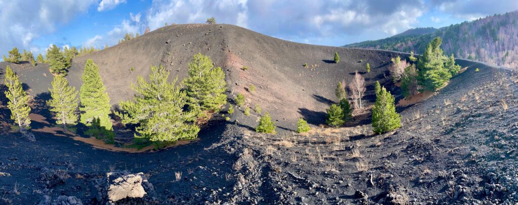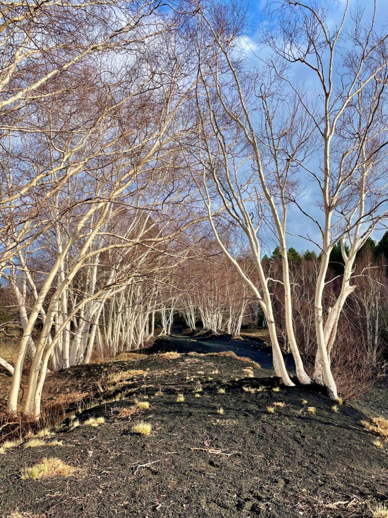 Wir wandern zum Ätna, gehen über Vulkanerde, erleben die aktive Mutter Erde, die weißen Birken betrachtend, die so ein krasses Gegenüber darstellen, dass das Herzchen vor Freude und Staunen hüpft.